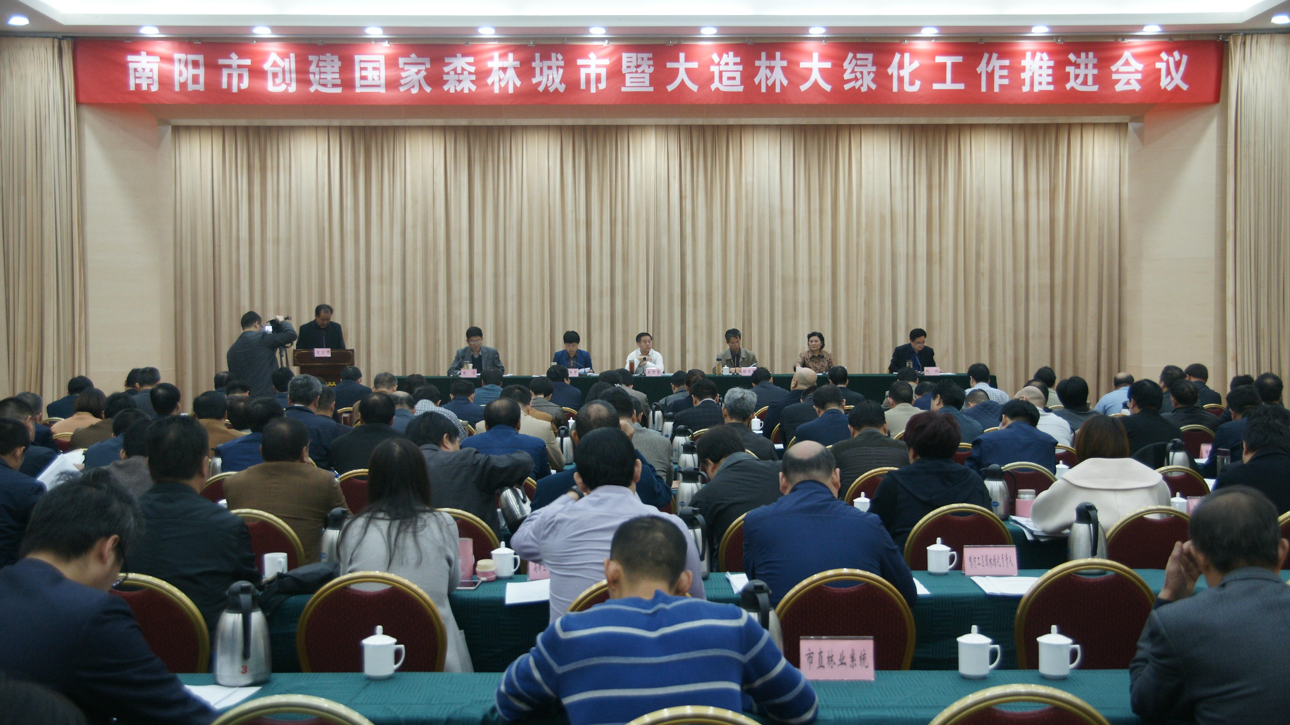 10月26日,市委、市政府召开全市创建国家森林城市暨大造林大绿化工作推进会议。市委副书记王智慧、市人大副主任程建华、市政府副市长刘庆芳、市政协副主席吴冬焕、市委副秘书长张岩,各县区政府(管委会)分管副县区长(副主任),县区林业局长(社会事业局长、农村工作局长)、县区园林绿化负责人;市2019年世界月季洲际大会筹备工作指挥部、创建国家森林城市指挥部、国家储备林基地建设工作领导小组、白河国家湿地公园建设工作领导小组、国有林场改革领导小组以及市绿化委员会、市护林防火指挥部成员单位负责人参加了会议。市委书记张文深、市长霍好胜对全市创建国家森林城市暨大造林大绿化等工作作了专题批示,市人大副主任程建华传达了批示精神;市政协副主席吴冬焕宣读了2017年全市大造林大绿化先进单位表彰决定;市委副秘书长张岩宣读了全市第四次大造林大绿化观摩评比情况通报;市林业局、市城管局、方城县、镇平县进行了发言。