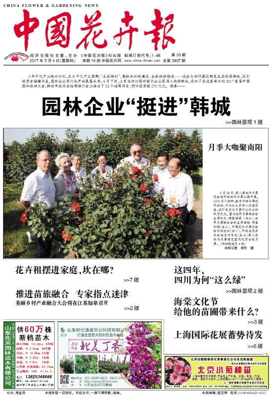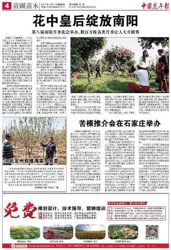 2017年5月4日,《中国花卉报》头版以"月季大咖聚南阳",第四版以"花中皇后绽放南阳"为主题,报道了第八届南阳月季花会的盛况,吸引了多位中外月季大咖的关注,再一次展示了花中皇后在南阳的无穷魅力!